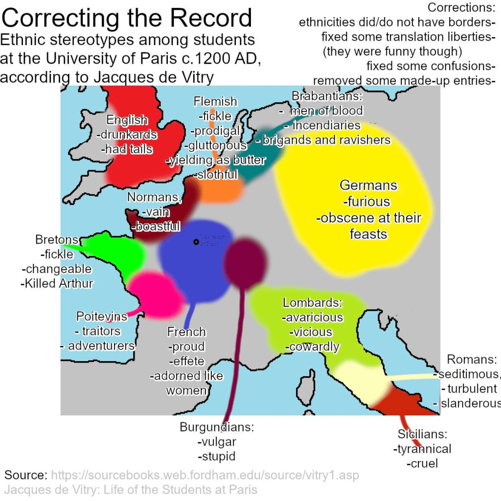 At a basic level, the tertium comparitionis of Christendom existed under which differences of custom and character could be observed. Through a religious prism, the earlier Romans(Eusebius, Orosius), Franks(Gregory, Hincmar), Visigoths(Isidore) and Anglo-Saxons(Bede) considered their gentes to have possessed a special relation to Providence. Note the special role assigned to the Franks in the prologus of the revised Salic Law under Pepin the Short, which positioned the race as the New Israelites, I have also discussed this in my crusader essay. There were oft-repeated origin stories of peoples from an ancestor group or an individual, implausible as they sound now, such as the Franks being Trojans or the burgeoning Swiss being migratory Swedes22. The imagery of patriarchs is evidence in of itself of the familial connotation which is implied, both within a nationality and as part of a brotherhood of nations with common origin. The “great Dane” chronicler Saxo Grammaticus constructed a genealogy in his Gesta Danorum to stress kinship between the English through the Angles and his own Danish folk, presenting the patriarchal brother pair Dan and Angul23. Evocations by saintly authorities include the association of Mosaic familial piety to the defence of the patria by St.Thomas Aquinas in his Summa Theologia24. Obvious considering that the mechanical clock was invented in Europe, physical location’s alignment with sacred time also factored, the Frankish Benedictine monk St. Rhabanus Maurus divided the world along an East-West Axis in which Persians and Greeks were people of the past, whereas the translation of Empire corresponded to a divine grace and salvific blessing bestowed upon the renewed West25. People differed in their form, through complexion yes, but also by their height, their piety, their capacity for intellect, even to their predilection for the drink. Transmission of Greco-Roman ethnography by Isidore, along with the oral popularity of Biblical stories, popularised the notion that these aforementioned capacities and lived manners(mores) were a product of inhabitation of different latitudes(clima). The Islamic world had it’s parallels, Ibn Khaldun, writing from modern Algeria thought of Syria as posessing the most suitable temperate clime, but thought lowly of the Cushite and Sudani peoples of first and second climes. The great Andalusian, Averroes(Ibn Rushd) also believed his home to be in the best climactic zone, like Greece, producing the “most balanced characters”. This was a form of geographic determinism. St.Albert Magnus’s treatise, De Natura locurum, as can be guessed from the title itself advanced the belief in European learning that natural properties were generated by the physical environment. The great teacher of Aquinas mixed theological commentary with humoral science when he repeated the commonly held belief that Jews had a predilection for haemorrhoids owing to their deicidal curse26. Lack of Jewish military acumen was attributed to their wide dispersion and the curse complementarily by Jacques de Vitry in his Historia Orientalis as well27. The people of this time also adopted the distinction between complexio innata and complexio naturalis, the former is where the phrase, “darkness/blackness of his soul” originates from. This puts into context a sermon by Raoul Ardens, a master of theology at the University of Paris, wherein he tells his audience on the occasion of the Feast of the Holy Trinity that the Jews must overcome their “innate disbelief”, the Poitevins their “innate garrulity” and the French their “innate arrogance”.28 This leads nicely into the genre of ethnic catalogues of vices and virtue, which served to sort physical properties through a topographical framework, an anonymous catalogue from 10th century Spain lists, “the strength of the Goths…the ferocity of the Franks…the rigidity of the Saxons, etc.”29 John of Fordun’s Scotichronicon uses nature as it’s guide, deeming the Normans bears, English foxes, Scots lions etc30. The Planeta of Castilian chancellor, Diego Garcia, was dedicated to the famed Bishop Jimenez de Rada and as part of his effusive praise for this clergyman, Garcia lists virtues associated with all peoples, and further flatters by adding that all these virtues were present in the Bishop31. Biblically, such comparative descriptions are found in the Blessing of Jacob on his deathbed, where Jacob recites the qualities and vices of his sons and in turns those who came from them. The influence of Hippocratic sanguine/humoral theory was evident in the common Crusading perception of the nomadic Turks being bloodless, thereby using Parthian retreat tactics, deemed dishonourable by the Franks who loved a head-on charge. This characterisation is found in Baldric of Dol’s detailing of the Turkish tactics at the Battle of Dorylaeum32. In effect, physical and mental traits were determined by the influence of the climate and the varieties of seasons and a given location, as it was for Aristotle, Hippocrates, Vitruvian and Pliny. Notably, the Mirror of Doctrine by Vincent of Beauvais, patronised by Louis IX, wrote of how the natural complexion reflected mental and physical state33. In French sources, the red-white sanguine was the ideal, with white skin marked by reddish cheeks demonstrating the perfect balance of heat and moisture. Pierre Dubois advised Philippe IV that his children ought to be raised in the climes of Northern France so that they would be fit to lead French armies in the Outremer and develop acute intellects to do so34. Imperial chronicler Otto of Freising, went so far as to state that the Ethiopians could not possibly be resurrected with the ‘affliction of their colour’, as he was no doubt paraphrasing Jeremiah 12:2335. This mirrors the association made between virtue(or lack thereof) and external colour by Dante in the Inferno when he describes the three faces of Satan in mimicry of